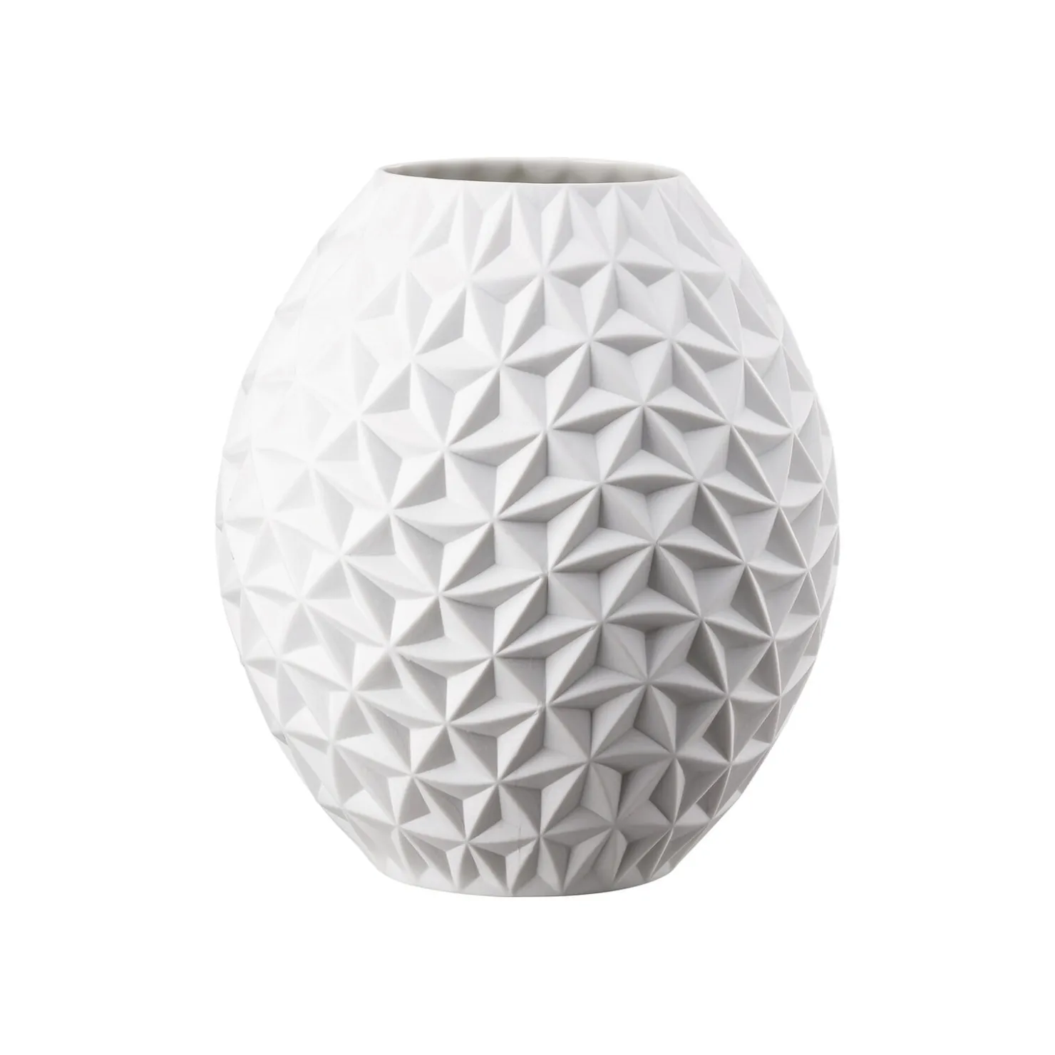 Freeze, Spindrift, City, Manhattan, Snow – komplexe, spiralförmig gedrehte geometrische Muster überziehen die weißen Porzellankörper mit überraschenden Oberflächenstrukturen und verwandeln sie in skulpturale Objekte mit innovativem 3D-Effekt. Dreiecke werden zu frostigen Blüten, Kristalle formieren sich zu Schneeflocken, kubische Körper bilden eine Skyline. Dazu gesellt sich ein Schuss Poesie, wenn sich das Licht auf der Oberfläche bricht. Schön als Einzelstück oder arrangiert als dekoratives Vasenensemble.